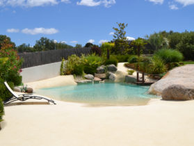 Realizamos a construção de toda piscina, desde desenho, escavação, concretagem, instalação de bomba e filtro, impermeabilização e revestimento com Areia Compactada Natursand, até o paisagismo com rochas e plantas que desejar.